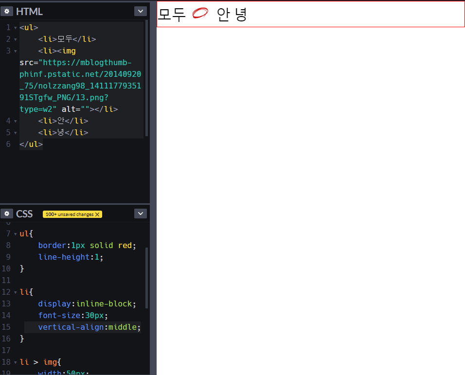 3. 인라인요소에 vertical-align을 적용시켜주면 수직가운데 정렬이 된 것을 볼 수 있습니다.